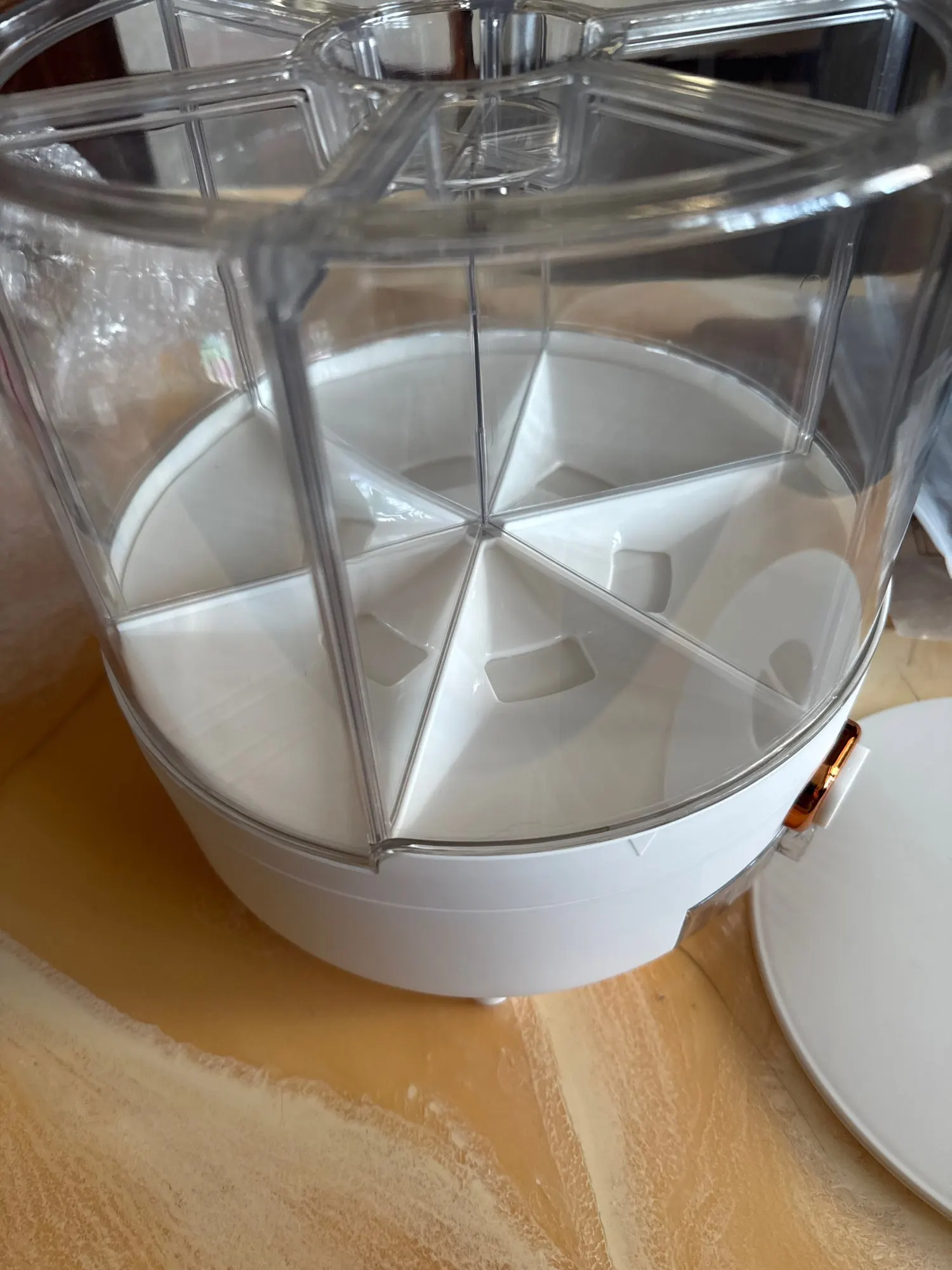Designed with six separate compartments, this rotating storage container keeps rice, cereal, beans, nuts, and grains neatly sorted in one space-saving unit. The 360° rotating base allows easy access to each section, while the airtight, moisture-proof seal helps preserve freshness and prevent contamination. Made from durable, food-safe material, it’s perfect for modern kitchens that value convenience and cleanliness.