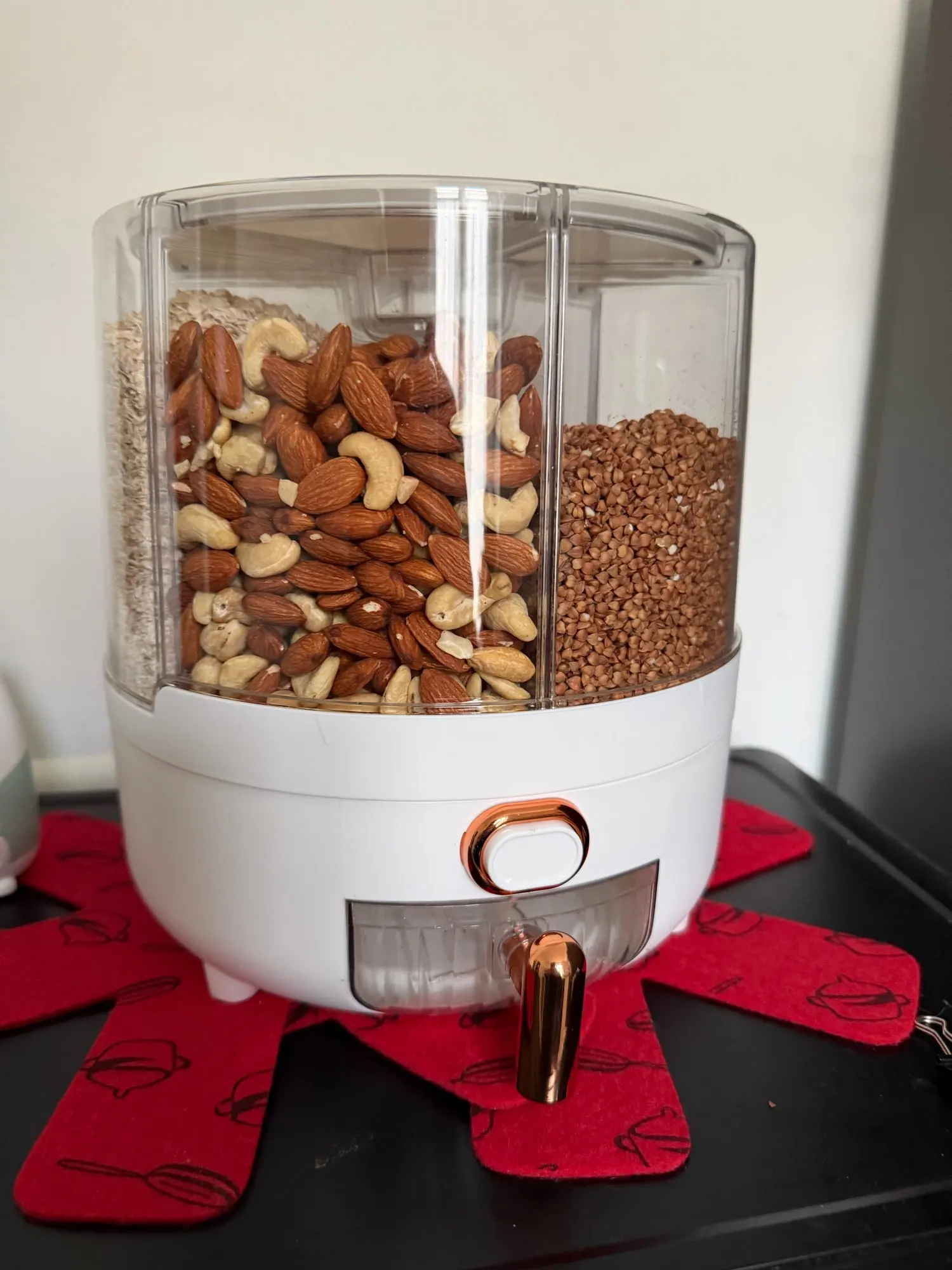 Rotate the container and dispense from your chosen section when needed.